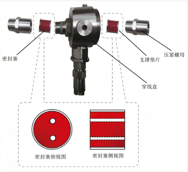 目前传感器接线盒通过螺纹连接方式安装在压缩机机壳上,主要是压力调整式密封盒,其结构部件是由接线盒外壳、穿线孔、紧固螺母、压紧螺母、密封塞等组成(图 2)。