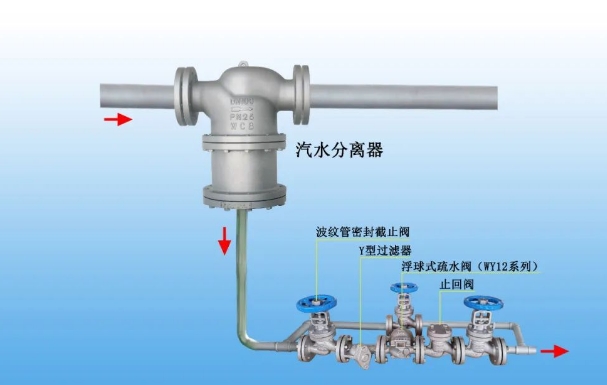 汽水分离器安装在减压阀前3米内,底部疏水阀组就近水平安装,最远不建议超过1米,避免蒸汽绑。