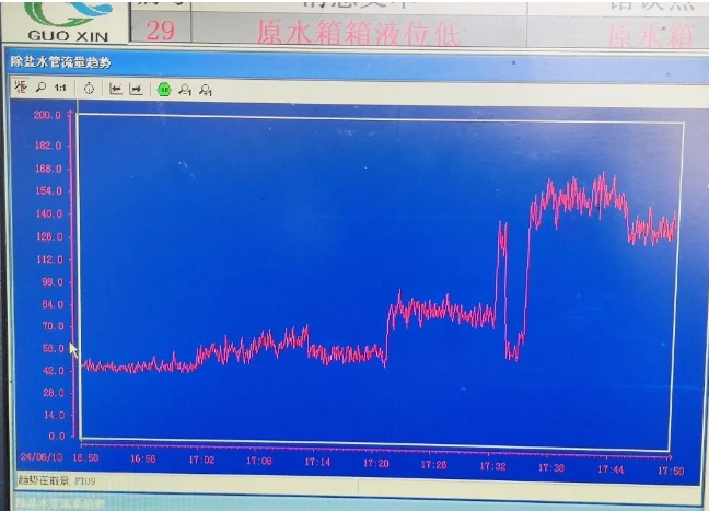 正常情况,除盐水泵60多安的电流流量能达到40多吨,现在电流降低到56.1A后,流量显示126.3吨。
