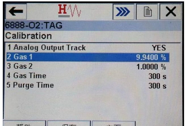 此时进入标定程序,按照提示通入Gas 1.连接好氧气浓度为9.94%的标气,流量稳定在2.5L/min,在HART中点击确认,开始计时300S。