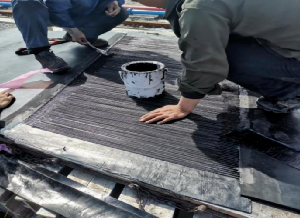3.4 在下加热板上铺上干净的报纸或玻璃纸,将覆盖胶的一头裁成与斜坡面相一致的斜接头,并对正带头覆盖胶斜坡面的上缘,铺平放置在报纸上。