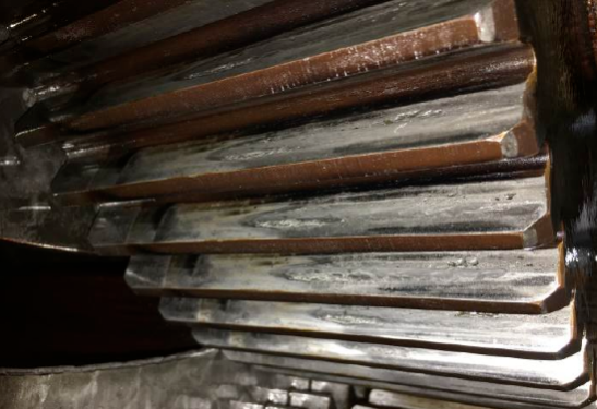2.减速机为外置低压稀油站润滑,机子拆开后,检测润滑油严重失效,发黑,粘度降低,内部铁粉沉积严重。