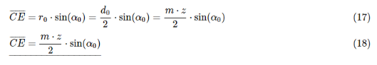 现在更仔细地观察上图中的橙色三角形。结果表明,标准压力角α0的对边对应于模数m与齿面位移V=x⋅m之差。因此,以下关系适用于节点 C 和接合端 E 之间的距离 CE: