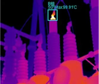 上图为变压器套管末屏发热的情况。变压器套管末屏在安装时如果没有安装到位,会在运行中放电、发热,如果长时间不处理可能会造成事故。但运行中的变压器不方便进行实际设备的检查,而红外测温可以有效进行识别。