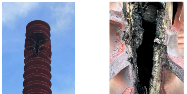 (1)A相故障避雷器解体情况:试验人员对避雷器进行拆解,解体发现A相避雷器内部上部分氧化锌电阻片基本为灰色粉末状固体,占总长约1/2,明显为长时间过电流发热引起的绝缘损坏,能量聚集到一定程度造成上端烧焦、炸裂;中部下电极导电杆呈银白色;下部导电杆有大面积铁锈,有受潮迹象,占总长约1/5;下电极周围出现烧黑痕迹,未见外部向下放电通道;底座绝缘垫块已经被电弧烧成炭黑色,如图4所示。