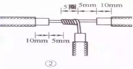 ⑤接着把这两股芯线按顺时针方向紧缠2圈后,再折回90° 并平卧在折起前的轴线位置上。