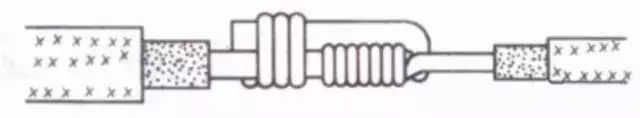 把细导线线头在粗导线线头上紧密缠绕5~6圈,弯折粗线头端部,使它压在缠绕层上,再把细线头缠绕3~4圈,剪去余端,钳平切口。